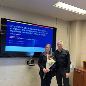 Rachel Korchinsky was issued an award from the Chemical Engineering Graduate Student Association (CEGSA) as part of the Queen’s University/Royal Military College Chemistry/Chemical Engineering Research Poster Day. She won the Best PhD Poster Award for her work “Forward Osmosis Followed by Reverse Osmosis for the Removal of Contaminants of Emerging Concern using a CO2-responsive Draw